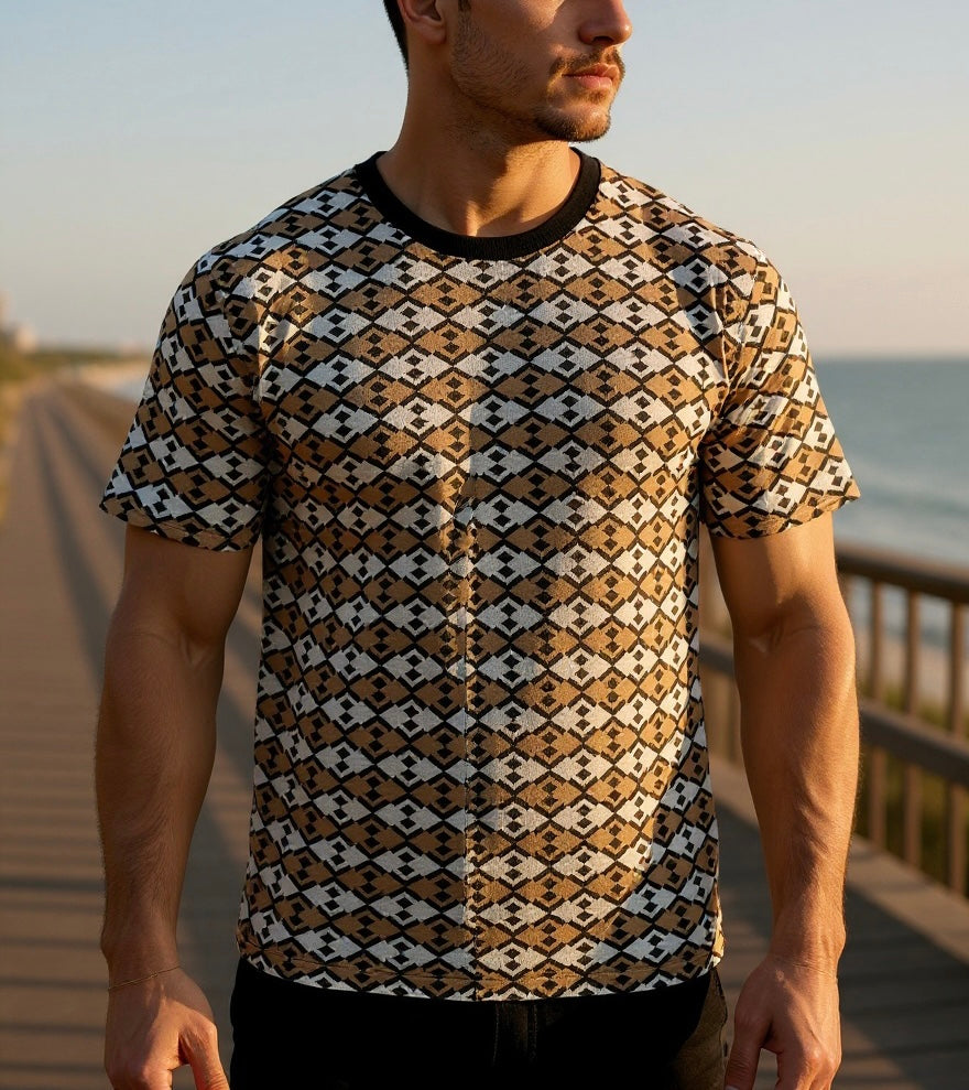 This T-shirt is crafted with a jacquard fabric, providing a subtle, patterned texture. The relaxed fit, short sleeves, and scoop neck design, paired with a front pocket, make it a stylish and comfortable choice for casual wear.
